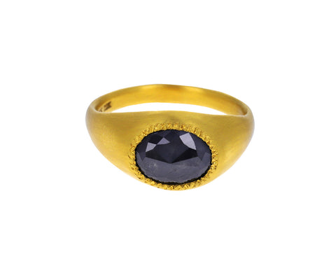 Gorgeous in its captivating sparkle, this Prounis ring is also a modern, sophisticated alternative to the traditional diamond engagement ring. The oval black diamond (1.53 ct) is horizontally set within a perfectly beaded frame in the brushed 22K yellow gold tapered band.