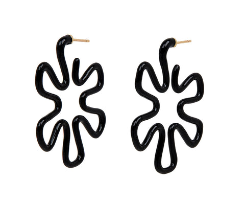 With their fluid design and playful style, these Bea Bongiasca hoops will add the perfect pop of whimsy to any collection. The sterling silver hoop is covered in a stark black enamel and made up of a wiggling line creating a flower design. They connect to 9K yellow gold post backs.