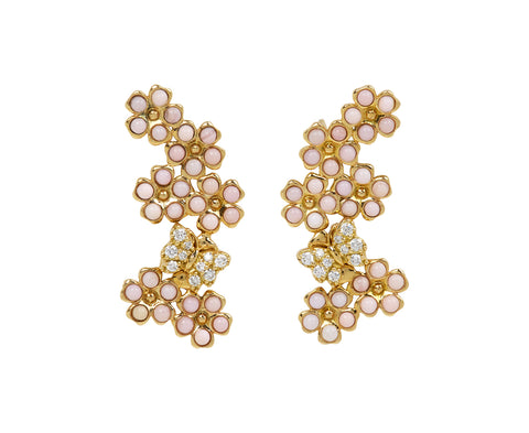 With their sweet composition and warm tones, these Grace Winfrey earrings have an understated sophistication. The 18K yellow gold drops are composed of pink opal flowers surrounding shimmering diamond butterflies. The flowers cascade down from the 18K yellow gold post backs, creating a perfect earring for wearing from day to night.