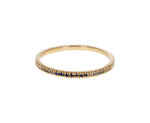 With a quiet, regal, and understated sophistication, this Rebecca Overmann ring is a striking, modern alternative to the traditional wedding band. The blue gray sapphires are prong set in the 14K yellow gold band according to tone. A wedding band alternative or addition to a stacking set!