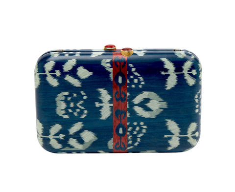 This stunningly intricate wooden marquetry clutch from Silvia Furmanovich is a modern work of art. Both sides of the navy wooden clutch are covered in white floral patterns and red bisecting stripe. Two carved brown agate ovals are set in 18K yellow gold at the top of the clutch and pull apart when opening the smooth rectangular shape.
