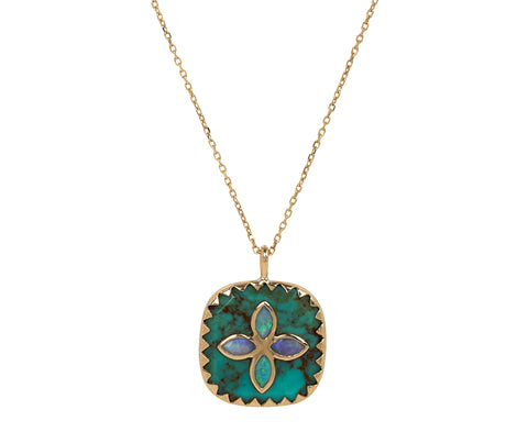 Add this effortlessly casual and elegant Pascale Monvoisin necklace to your personal, layered necklace collection. Hanging from the center of the 9K yellow gold chain is a square pendant of turquoise set with a cross of shimmering opal. The pendant is framed in 9K yellow gold adding to the softness of the look. Quietly elegant and perfect for everyday, this necklace embodies a bohemian, feminine style.