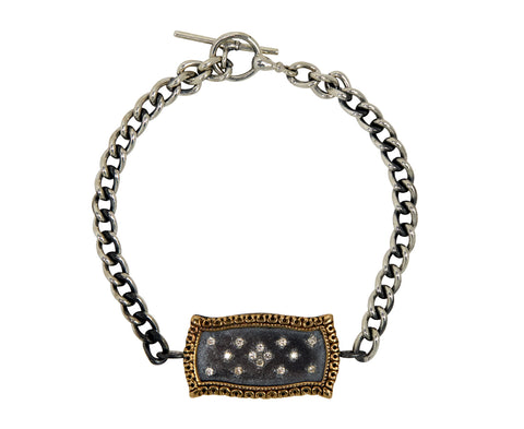 With a hint of sparkle, this Rusty Thought bracelet adds an earthy, casual elegance to any collection. The bar has stars of shimmering diamonds set across it's surface and sits in a bezel of 10K yellow gold with textured edges. It is centered on the sterling silver chain bracelet.