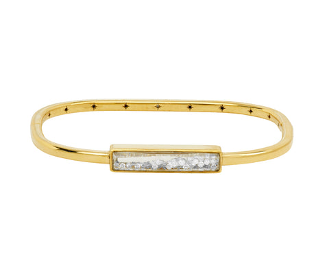 Distinctive and delicate, this signature Moritz Glik bracelet looks perfect alone or layered with your other favorites. Shimmering white diamonds are encased in the 18K yellow gold bezel set faceted white sapphire shaker. It's set at the center of the squared off 18K yellow gold bracelet. With each movement, the stones become a fluid, dynamic element of the bracelet. One bezel set diamond is set at the back of the bangle for a hidden hint of extra sparkle.