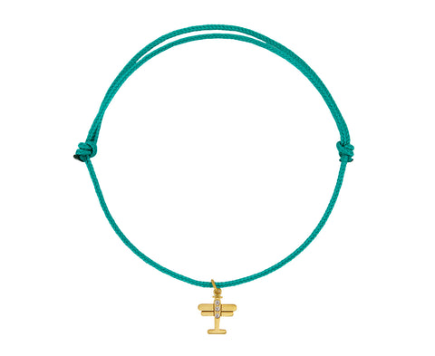 Playful, casual, and with a hint of cool toned color, add this Marie-Hélène de Taillac bracelet to your layered collection. Hanging from the adjustable emerald green nylon cord is a 22K yellow gold and diamond airplane.