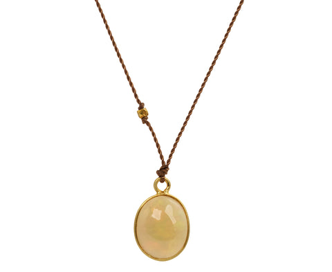 Full of fiery, brilliant iridescence, this Margaret Solow opal cabochon necklace has a modern, minimal vibe. The drop of opal is polished smooth and set in a thin frame of 18k yellow gold. It is knotted at the base of a nylon cord to create a necklace with elegant, versatile style.