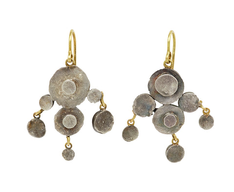 With her signature, playful geometry and intentional asymmetry, Judy Geib has created a pair of earrings with eclectic elegance and sophistication. The 18K yellow gold dimensional circles create a shape echoing a girandole. Each earrings has a trio of 18K gold circles anchoring the composition which hangs from the 18K gold ear wires.
