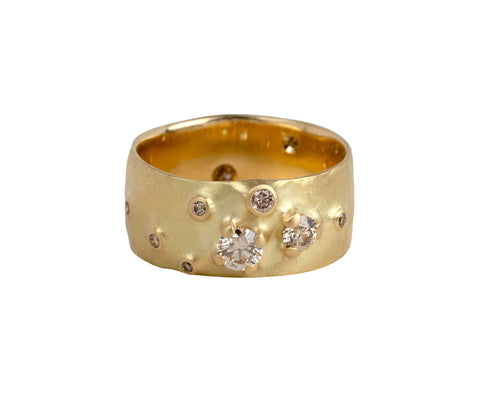 Absolutely gorgeous in its perfectly imperfect design, this Johnny Ninos band is a perfect alternative to the traditional wedding band. A collection of shimmering, round cognac and champagne diamonds are set along the 18K yellow gold. The seemingly random pattern adds to its edgy sophistication.