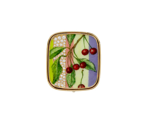 Stemming from collages she made, this Francesca Villa ring was hand-painted by a miniature artist to represent the sweetness and duality of life. The large, rectangular ring face has a surface of enamel cherries on a vibrant picnic cloth. A stripe of shimmering white diamonds accents the composition. On the reverse side of the ring is a large, vintage Japanese cameo, representing our adult nature. Line up the triangles to push up and flip the ring.