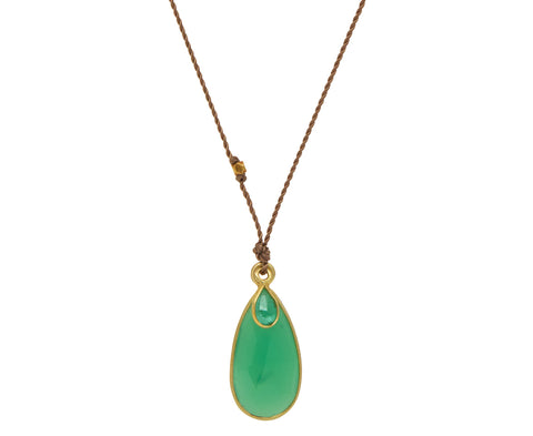 With its lush color palate and understated sparkle, this Margaret Solow necklace exudes a feminine, earthy allure. The faceted drops of chrysoprase and emerald stones are covered in a surface of light reflecting facets and framed by a thin band of 18K yellow gold. They are knotted at the base of an espresso nylon cord to create a quietly captivating necklace you can wear everyday.