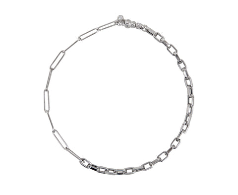 Perfectly balancing modern design with easy-to-wear style, this Milamore bracelet looks perfect whether worn alone or added to your bracelet stack. The two chains of 18K white gold are the perfect combination of wider gauge chain and gauge wire. Tiny white diamonds are set along the base of the 18K white gold lobster clasp.