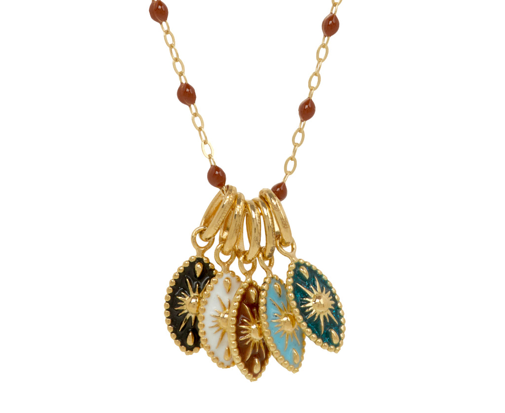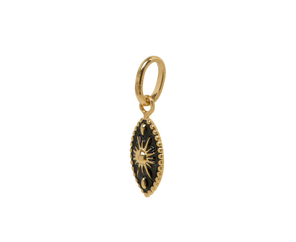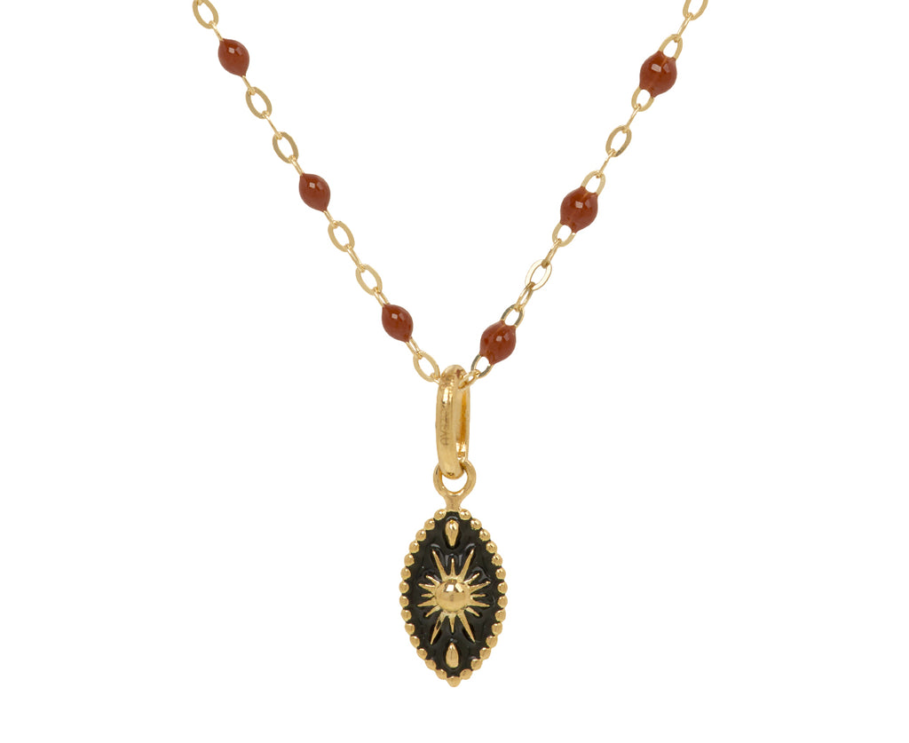 Add this playful Gigi Clozeau pendant to any of her stunning beaded necklaces, or even one of her bracelets! The 18K yellow gold Karma pendant has a lightly textured rim and black enamel surface. The gold sun on the marquise shape is the perfect symbol of protection and light. Here we have it hanging from her super sparkle resin necklace.
