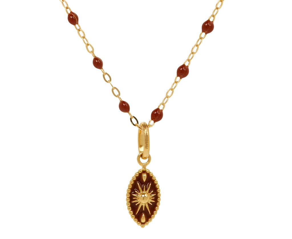 Add this playful Gigi Clozeau pendant to any of her stunning beaded necklaces, or even one of her bracelets! The 18K yellow gold Karma pendant has a lightly textured rim and mocha enamel surface. The gold sun on the marquise shape is the perfect symbol of protection and light. Here we have it hanging from her super sparkle resin necklace.
