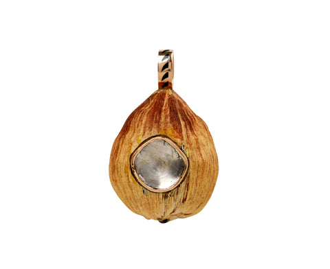 With its playful, beach-themed design, this Dezso pendant perfectly balances earthy luxe and effortless style. The natural coquito shell is set with an 18K rose gold bezel set polki diamond in its surface. It is topped with an 18K rose gold and black enamel shark fin bale.