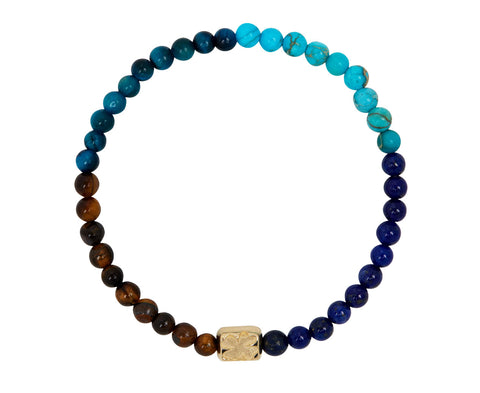 This Luis Morais bracelet is perfect nestled in with your wrist full of favorites or on it's own. The turquoise, lapis and tigers eye beaded bracelet has a 14K yellow gold ingot in the center with the four leaf clover on one of the four sides.