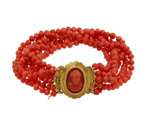 Hand-selected by For Future Reference Vintage, this coral beaded bracelet is a stunning multi-strand composition. Each smooth coral bead is tightly strung together and the dense collection of strands surrounds the 18K yellow gold and cameo clasp. The perfect way to add a pop of color to any collection.