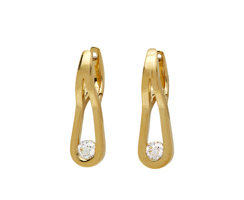 Dramatic yet easy-to-wear, these Melissa Kaye earrings up the ante on the traditional huggie hoop. The 18K yellow gold huggies are anchored by a shimmering round diamond cradled by a tapered 18K yellow gold drop. They connect to 18K yellow gold ear wires.