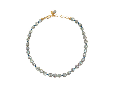 This minimal White/Space bracelet is a modern take on the traditional pearl bracelet. The silver pearls are strung together along the blue cord to create the continuous strand. It closes with an adjustable 14K yellow gold clasp. It has an air of elegance and can be worn alone or stacked with more casual pieces.
