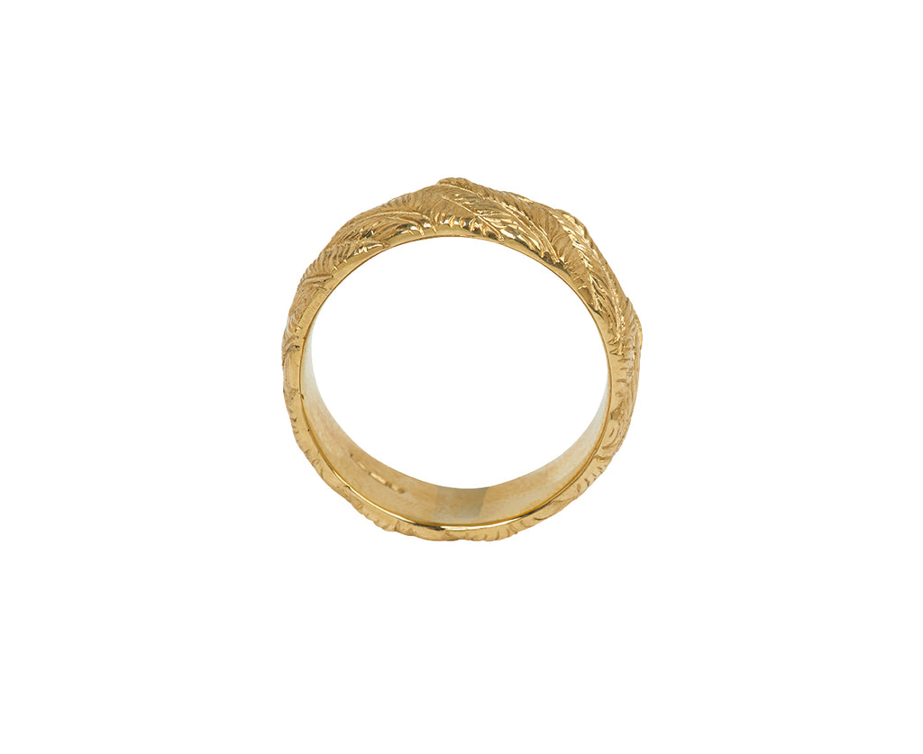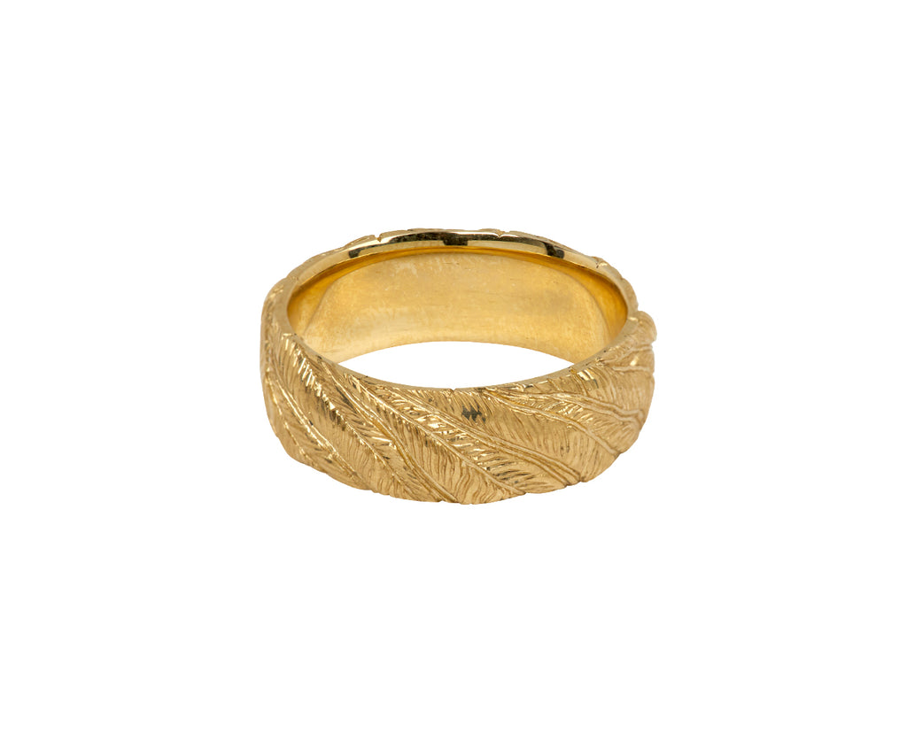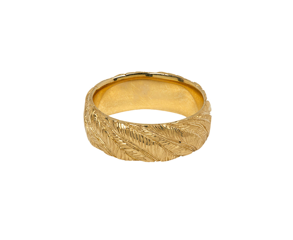 This Castro Smith ring has been carefully hand engraved with individual feathers. The wide, matte 9K yellow gold band is entirely engraved, begging for a closer look with its stunning texture and dimension. Perfect for the person with an understated yet modern style.