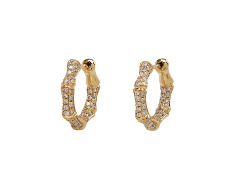 With their retro-inspired design and sweet sparkle, these Anita Ko hoops are your new go-to pair. The 18K yellow gold bamboo hoops are covered in tiny white diamonds. An interior row of diamonds are set along the back for extra sparkle and they connect to 18k yellow gold latch backs. Wear them as your main earrings or in a multiple piercing.