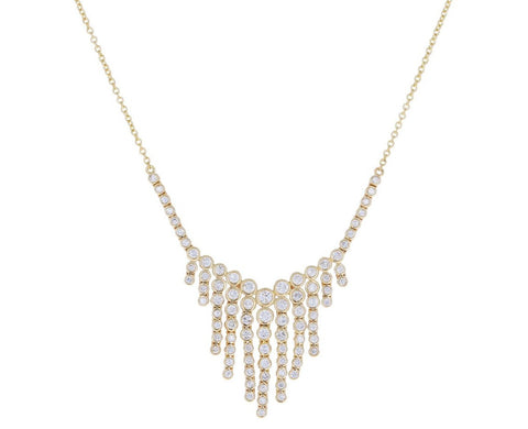 With its slinky, sculptural and modern vibe, this ONDYN necklace is a stunning alternative to the traditional diamond necklace. Each bezel set sparkling white diamond is linked together to create a pendant with a fluid design and fringe that moves slightly with you. Finished with an adjustable sliding bead at the clasp for versatility, this necklace can be worn at any length.