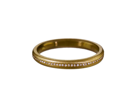 This Mandrel Studio ring features a row of shimmering, perfectly round diamonds bisecting the center of the 18K yellow gold band. Whether worn as a wedding ring, symbolizing an anniversary or celebrating a special occasion, this ring is the perfect balance of modern design and timeless sophistication. Pair it with a Mandrel Studio solitaire to complete the set!