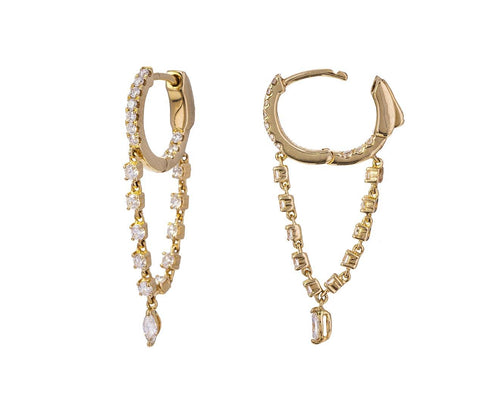 These Anita Ko diamond hoops take the huggie style to a whole new level of luxe and sophistication. The small, diamond set huggies are anchored by a 'v' of front facing diamonds set in a flexible chain. Tiny diamond marquise anchor each earring to create movement and additional sparkle.