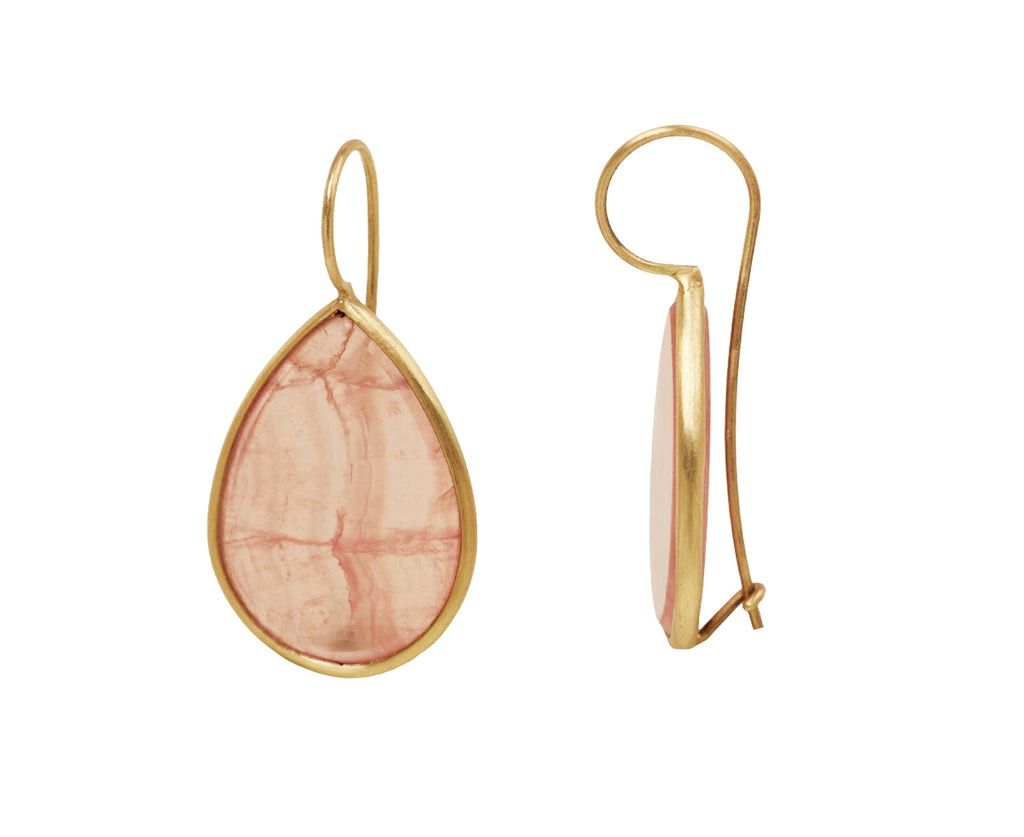 With their warm toned color and minimal design, these Anaconda earrings exude a subtle sophistication. The smooth drops of perfectly pink rhodochrosite are covered in surfaces of light reflecting facets to reveal their natural characteristics. Each stone is framed in a thin band of 9K yellow gold which attaches to the 9K yellow gold ear wires.