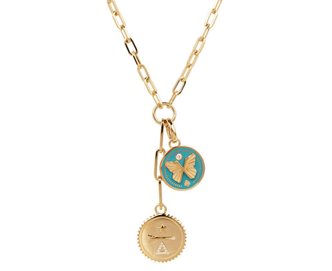 Solid and substantial, this Foundrae necklace will become your everyday talisman. Hanging from the 18K yellow gold refined clip extension at the base of the 18K yellow gold classic fob clip chain is a round, 18K yellow gold and diamond medallion. A turquoise ceramic butterfly pendant connects to the belcher chain with a removable 18K yellow gold push gate annex link. With its bold, emblematic presence, it's a perfect necklace to wear every single day.