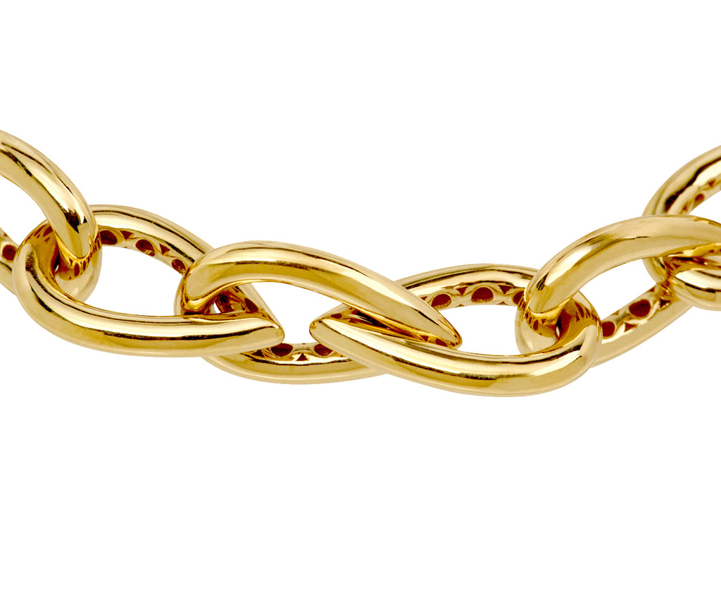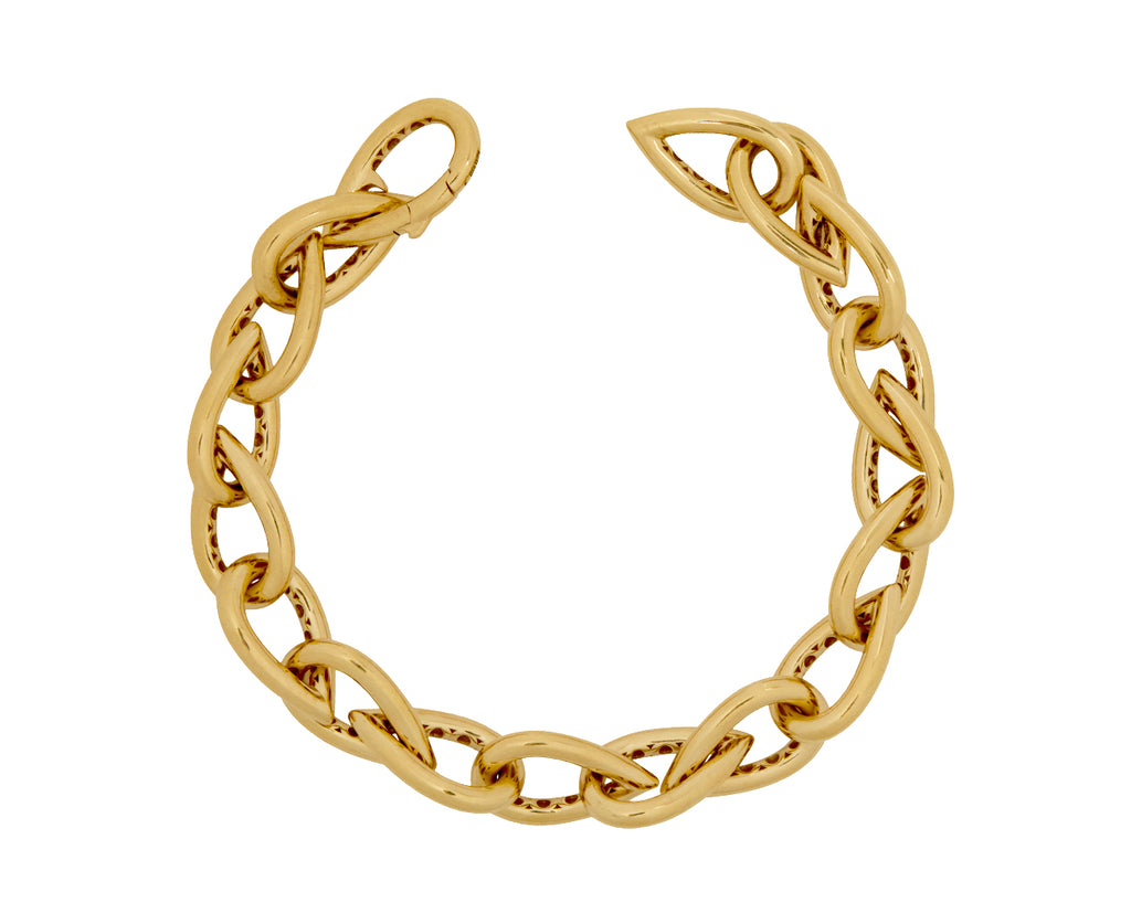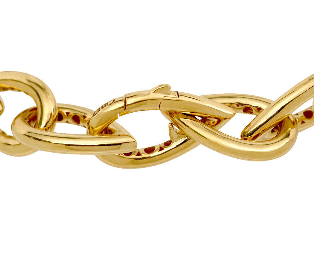 With a slinky, modern elegance, this Engelbert bracelet packs a serious punch. Each polished 18K yellow gold drop link connects to create the chunky strand. It closes with a seamless 18K yellow gold push clasp and could easily be worn with or without your other favorites.