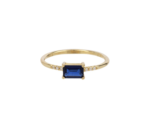 Stunning in its minimal design and hint of cool toned color, this Jennie Kwon ring is perfect worn alone or stacked with your other favorites. The rectangle deep blue sapphire is set in 14K yellow gold prongs between tiny shimmering round diamond. . The composition sits at the center of the polished 14K yellow gold band. This ring would also make a perfect engagement ring for someone with a quiet, classic sense of style.