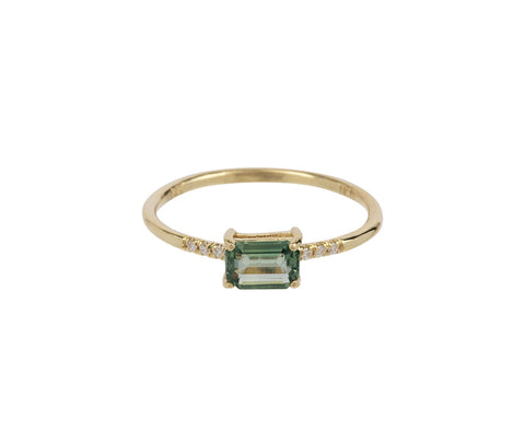 Stunning in its minimal design and hint of earthy color, this Jennie Kwon ring is perfect worn alone or stacked with your other favorites. The emerald cut green sapphire is set in 14K yellow gold prongs between tiny shimmering diamonds at the center of the 14K yellow gold band. This ring would also make a perfect engagement ring for someone with a quiet, classic sense of style.