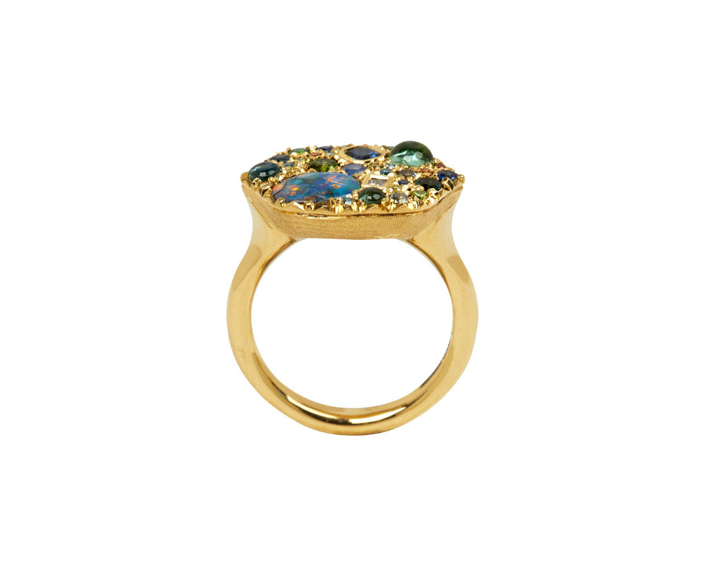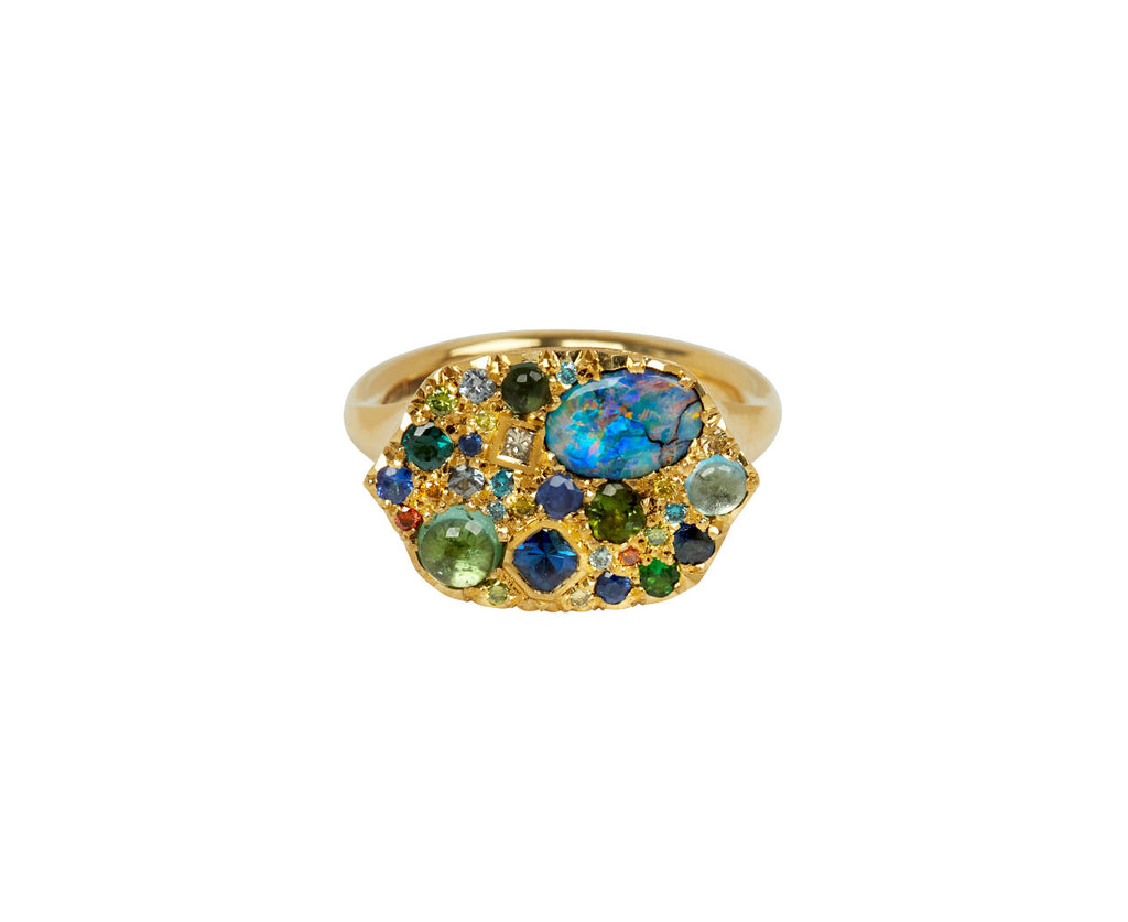As a moody, vibrant enchanted forest, this Hargreaves ring has a stunning sparkle and hand-carved design. A smattering of paraiba tourmaline, black opal, antique diamonds and blue and green sapphires are set in a one-of-a-kind composition along the oval 18K yellow gold ring face. It is set at the center of the polished 18K yellow gold band and has a tiny fern engraved on its back.