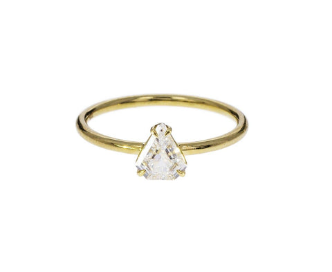 Stunning in its classic simplicity and timeless elegance, this Mandrel Studio diamond solitaire is certainly a 'forever' ring. The fancy angular cut clear diamond (,56ct) shimmers with light from within. It is held in place by four prongs and centered on an 18K polished yellow gold band to create a stunning, eye-catching ring that will never go out of style. Pair it with a Mandrel Studio wedding band and your set is complete!