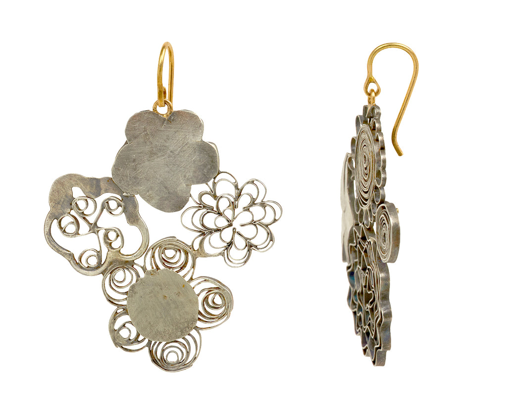 With their airy, earthy design, these Judy Geib earrings are a playful expression of her brilliant creativity. Each of the earrings is a drop of clustered, hand-wrought sterling silver flowers which hang from 18K yellow gold ear wires.