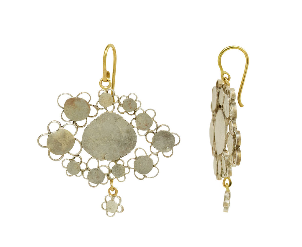 Playful, airy, and full of movement, these earthy Judy Geib earrings are a perfect balance of form and space. The sterling silver flowers connect to one another and are anchored by an additional dangling flower. The intentionally asymmetrical composition hangs from 18K yellow gold ear wires.