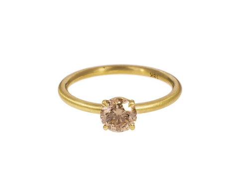 Classic in concept, but modern in design, this Mandrel Studio diamond solitaire is as stunning as it is feminine. The round full cut champagne diamond (.82ct) shimmers with a surface of light reflecting facets. It is framed simply by 18K matte yellow gold prongs and centered on a 18K yellow gold wire band. Pair it with a Mandrel Studio wedding band and your dream has begun!