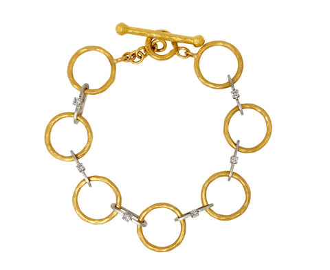 Stunning in its hand-crafted design and combination of materials, this Cathy Waterman bracelet is a modern alternative to the traditional gold chain. Each of the round, 22K yellow gold links connects by an elongated platinum and diamond link. It closes with Cathy's signature toggle clasp.
