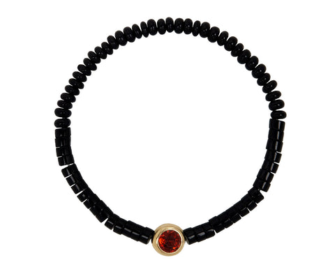 This Luis Morais bracelet is perfect nestled in with your wrist full of favorites or on it's own. The black gemstone beaded bracelet has a 14K yellow gold circle charm in the center set with a fiery garnet.