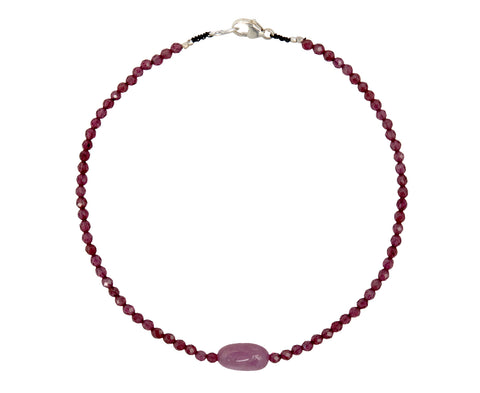 Delicate and distinctive, this Margaret Solow bracelet is the perfect addition to any casual jewelry collection. Faceted rounds of deeply hued garnet are arranged along the length of a nylon cord to create a shimmering strand with a smooth, oval red ruby bead at the center. Quietly cool on its own, this also looks great nestled in with your other favorites.