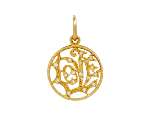 This is one of Cathy Waterman's signature charms. Sweetly sparkling with tiny diamonds set in warm, 22K yellow gold, this dime-sized charm has in its center the word "love" in Cathy's stylized design. Wear it with your other favorite pendants in a personalized collection or solo - it makes a magical statement either way. Here we have it hanging from her gold tiny lacy chain (sold separately).