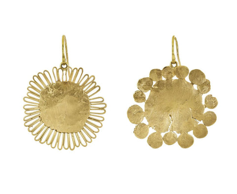 Stunning in their bold and playful mismatching, these Judy Geib earrings are a delightful geometric composition. Hand-wrought in 18K gold, each flower has its own distinctive shape. They dangle from gold ear wires and cheer up even the most straightforward outfit.