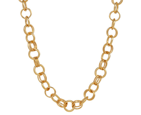 Jane Diaz has created a perfect piece that goes just as well with a cute everyday top as a little black dress, this necklace will quickly become your favorite go-to. Circular links of gold plate are connected to form this stand-out necklace, with every other link being three links together. A great length that's easy to wear, it adds a pop of style and sophistication to any outfit.