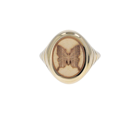 With its vintage inspired design and substantial weight, this Retrouvai ring has a statement-making style. The 14K yellow gold signet ring showcases a dimensional butterfly and is engraved on the inside with the message "spread your wings". It is centered on the tiered 14K yellow gold band, creating a ring that is both classic and modern.