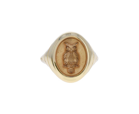 With its vintage inspired design and substantial weight, this Retrouvai ring has a statement-making style. The 14K yellow gold signet ring showcases a dimensional owl and is is engraved on the inside with the message "see things differently". It is centered on the tiered 14K yellow gold band, creating a ring that is both classic and modern.