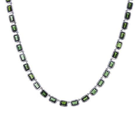 Bold and vibrant, this Nak Armstrong necklace also exudes an edgy, modern vibe. Each of the emerald cut green tourmalines are framed in black rhodium plated sterling silver to create the individual links. Wear it alone as a casual addition or layer it with your other favorites.