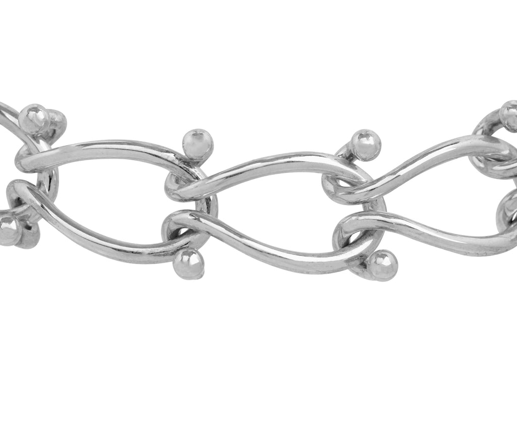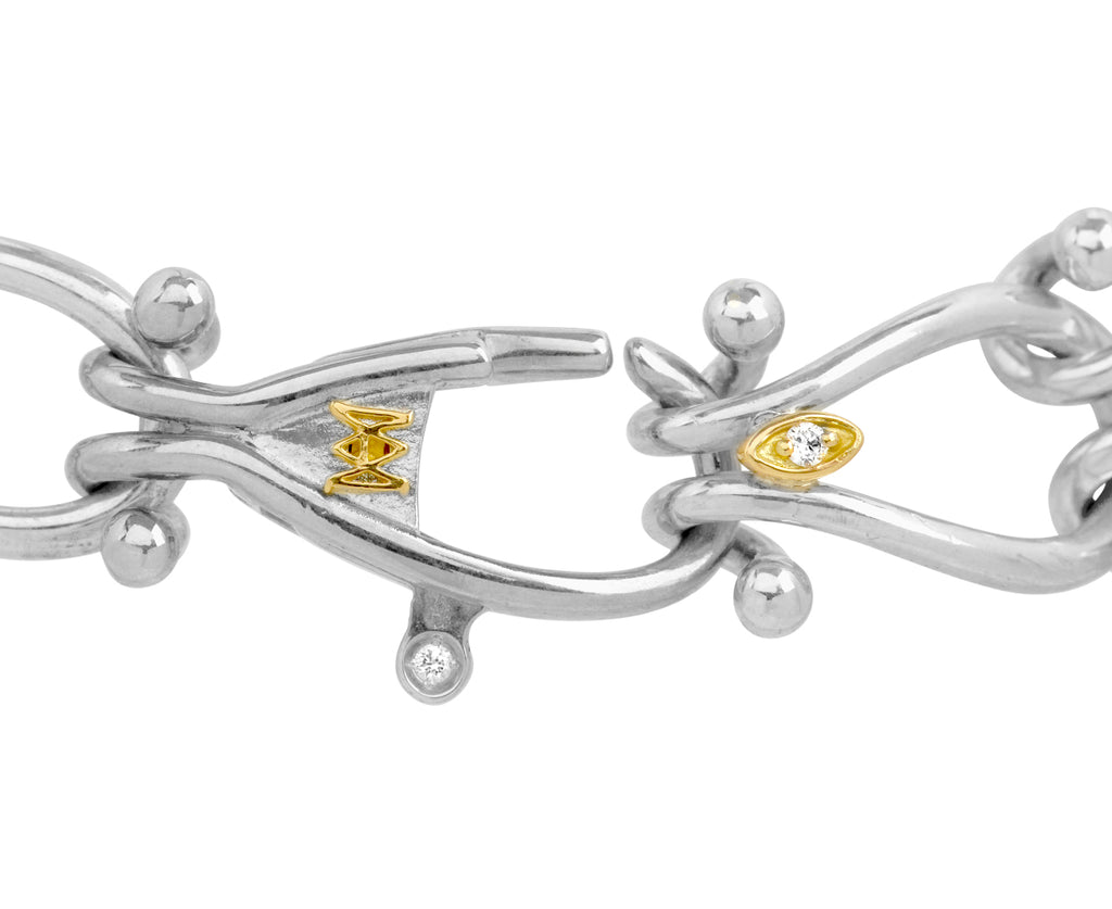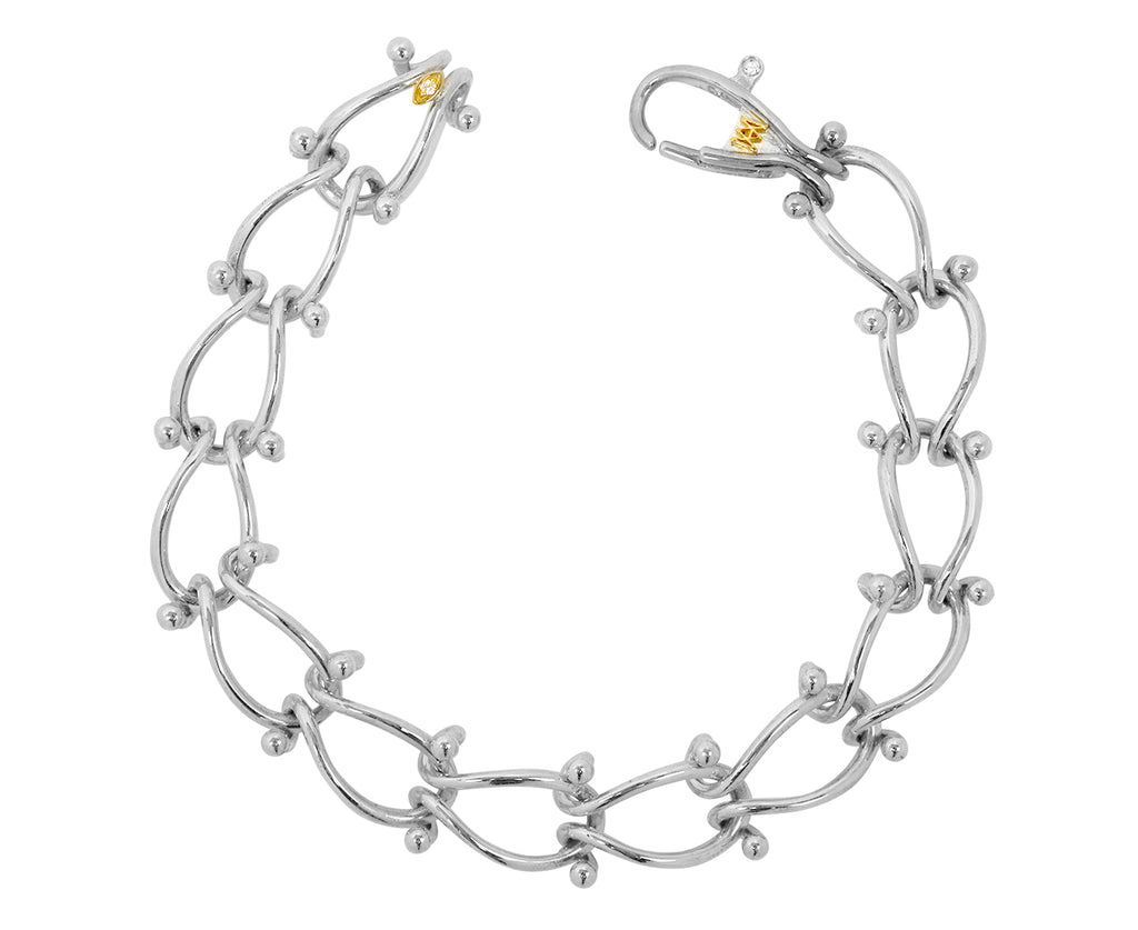This Milamore bracelet is a bold, modern alternative to the traditional chain. Inspired by chie-no-wa, a Japanese brain teaser of interlocking forms, the sterling silver links interconnect like an articulated puzzle. Finished with Milamore’s emblem and a marquise detail in 18K gold, accented by a natural diamond.
