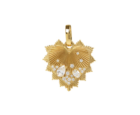 With its symbolic, statement-making presence, this Foundrae pendant can be worn alone or with your other Foundrae favorites. The 18K yellow gold heart has an engraved surface and a triangular halo. Mixed shape white diamonds are scattered along the bottom of the heart for a ton of sparkle and texture. It hangs from an 18K yellow gold push gate link, allowing it to seamlessly be added to their chains.