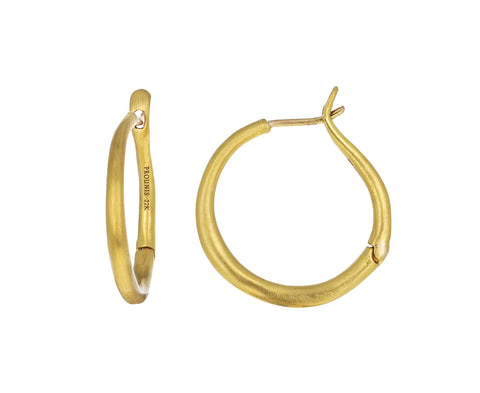 With their subtly tapered, hinge design and timeless elegance, these Prounis hoops will quickly become your everyday go-to pair. The solid hoops of 22K recycled yellow gold open with the center hinge and fasten with latch back closures.