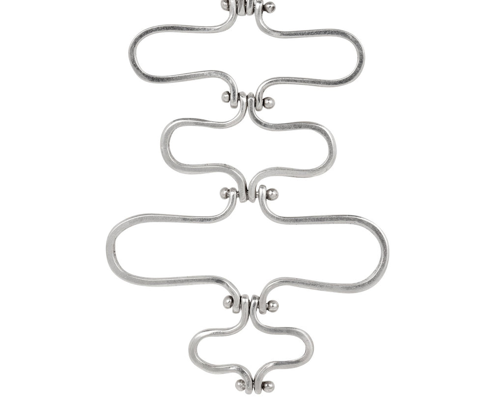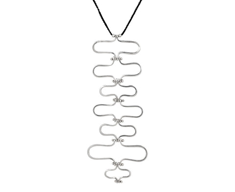 Like a modern mobile, this Jill Platner necklace has a dramatic, geometric presence. Wrought in hand-crafted sterling silver, the shapes connect with small bars allowing subtle movement to the pendant. The drops hang in a vertical arrangement from the center of a thin, hand-crocheted strand of black goretex.